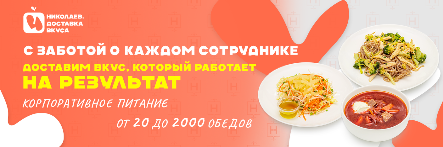 «Николаев. Доставка Вкуса» – это: Вкусно – авторские рецепты и свежие продукты; Удобно – полный цикл от производства до доставки; Надежно – работаем по России с 2010 года; Выгодно – индивидуальные условия для каждого клиента.