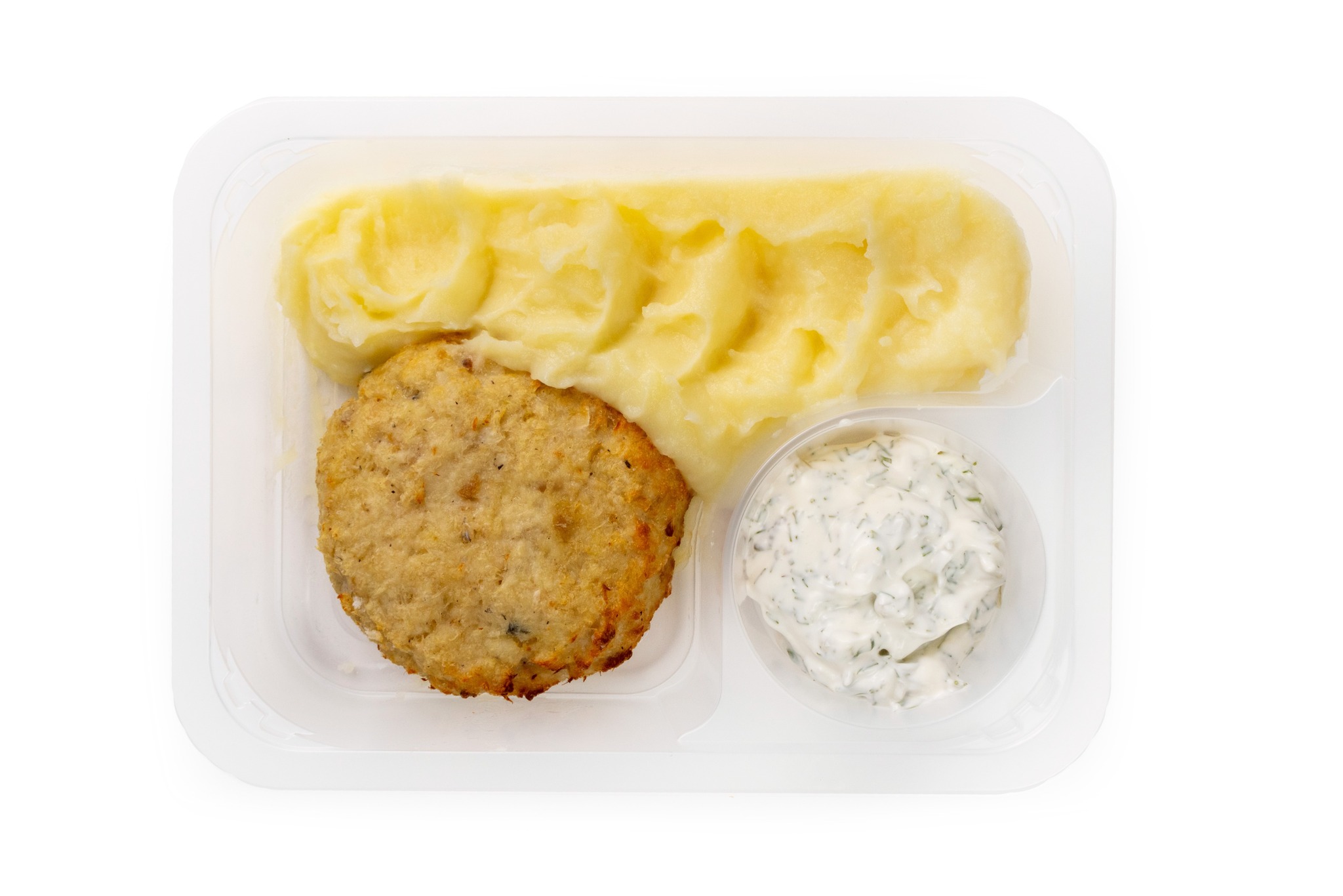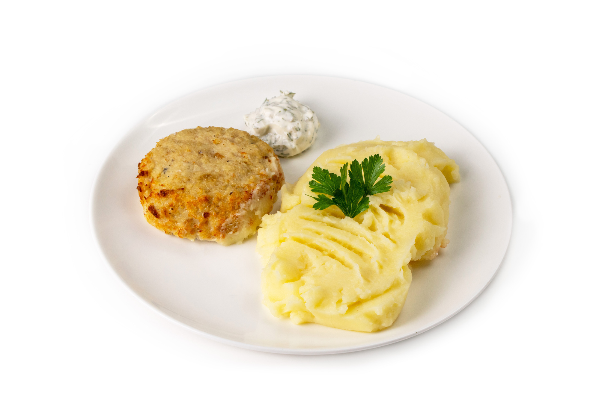 Рыбные котлеты от производителя "Николаев. Доставка вкуса" — это сочное филе в хрустящей панировке, поданное с воздушным картофельным пюре, хрустящей брокколи, томатами черри и ароматным соусом тартар. Идеальный баланс нежности и пикантности.