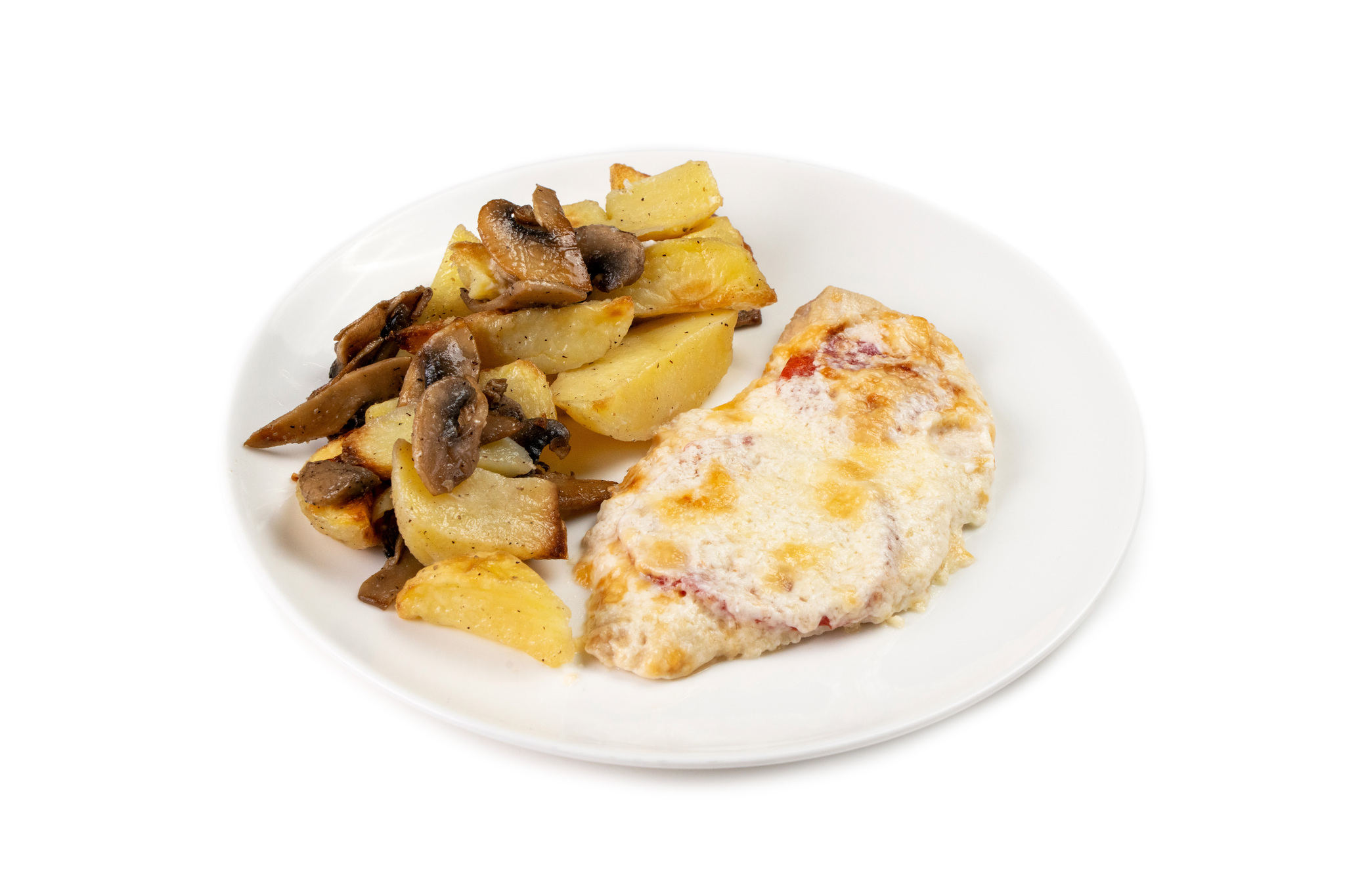 Курица по-французски от "Николаев. Доставка Вкуса" — это сочные куриные отбивные, запеченные под слоем расплавленного сыра с маринованными огурчиками и помидорами. Идеальный баланс нежного мяса, пикантных овощей и золотистой сырной корочки. Подается с гарниром Картофелем по-деревенски с грибами.