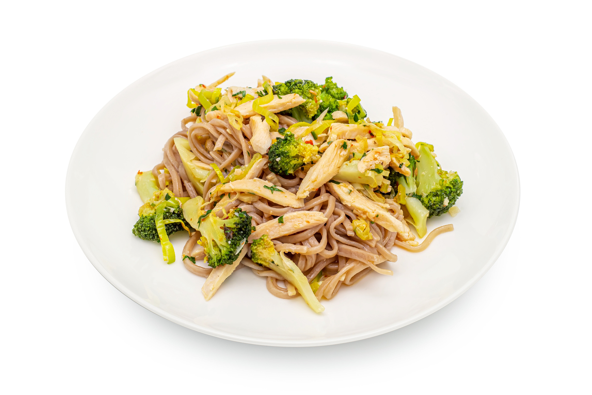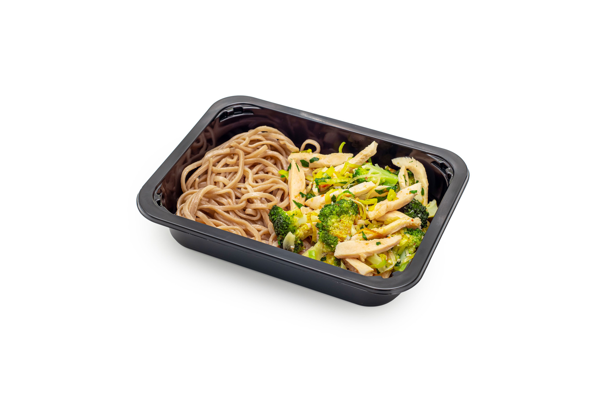 Состав: Лапша гречневая, грудка куриная, брокколи, лук порей, соус соевый, масло растительное, соус чили, кунжут, перец чили.
