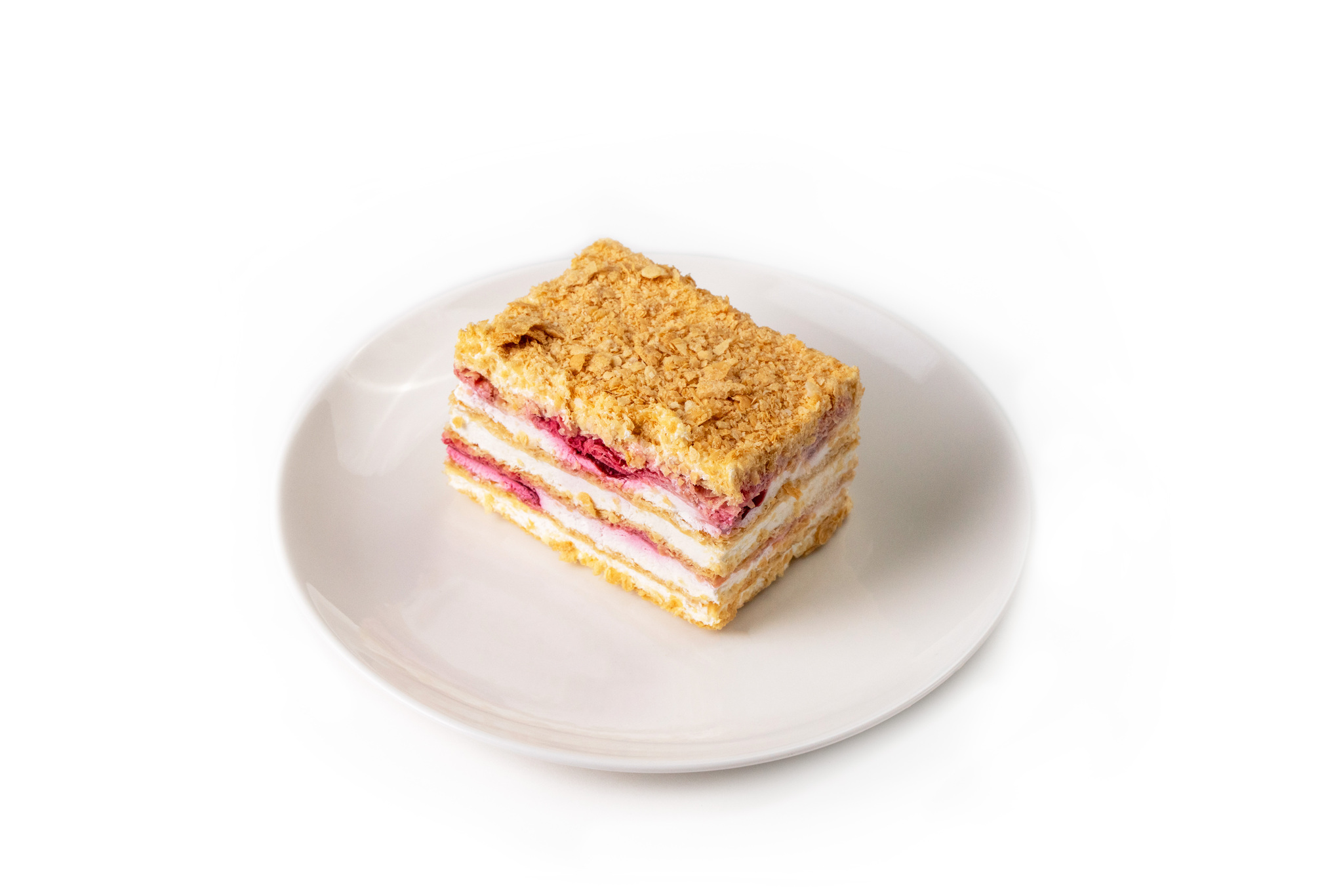 Обновлённая классика с яркой вишнёвой ноткой! Наше пирожное "Наполеон" сочетает нежнейшие слоёные коржи, воздушный заварной крем и сочную вишню. Лёгкая кислинка ягод идеально балансирует сладость крема, создавая гармонию вкусов. Каждый кусочек — это праздник для настоящих гурманов!