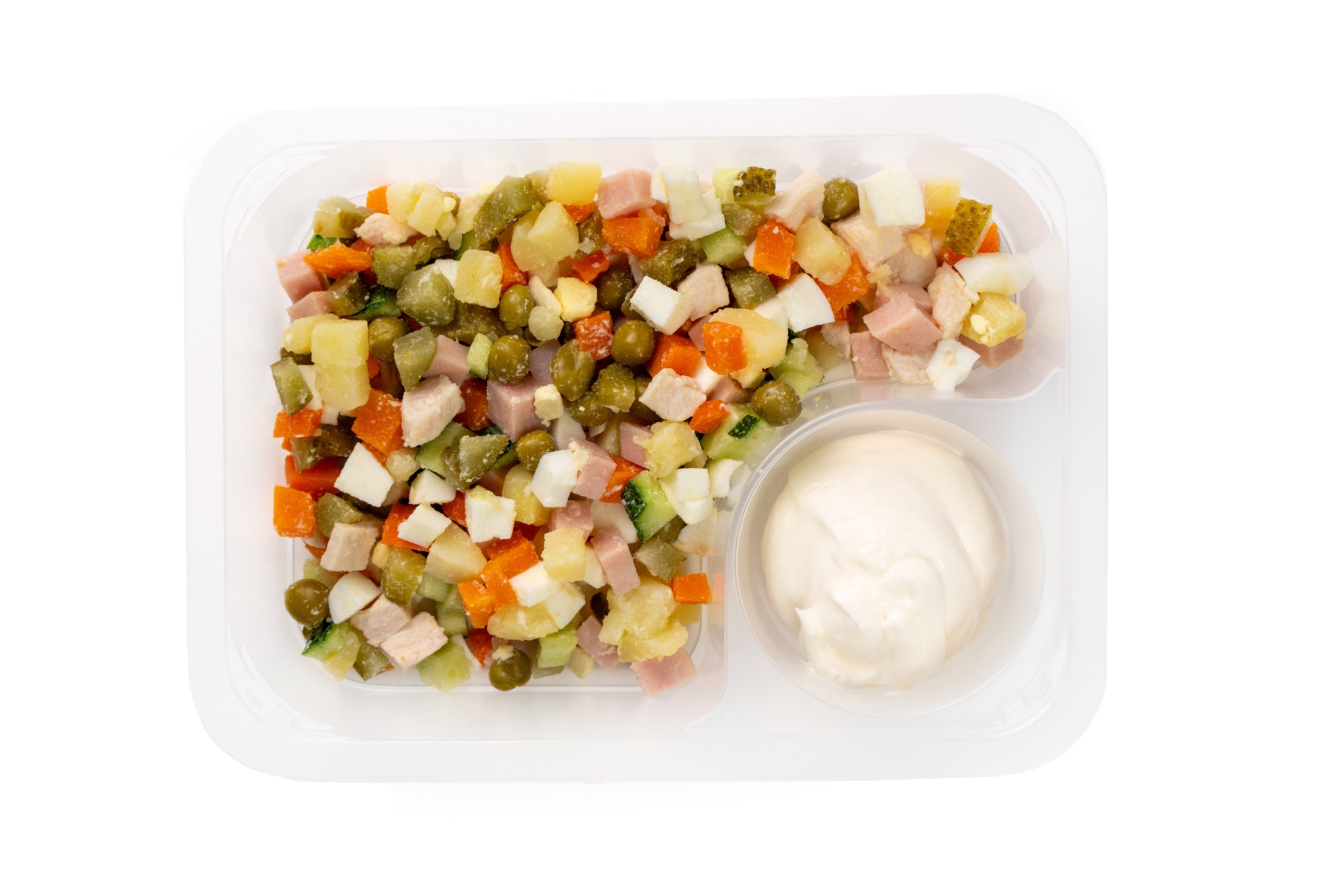 • Картофель отварной, • филе куриное охлажденное отварное, • ветчина (свинина/говядина, специи, соль, стабилизаторы), • морковь отварная, • огурцы маринованные, • яйцо куриное отварное, • горошек зеленый консервированный, яблоки свежие, лук репчатый, зелень свежая (укроп, петрушка), • майонез (масло подсолнечное, яичный желток, горчичный порошок, уксус, сахар, соль, загуститель), соль.
