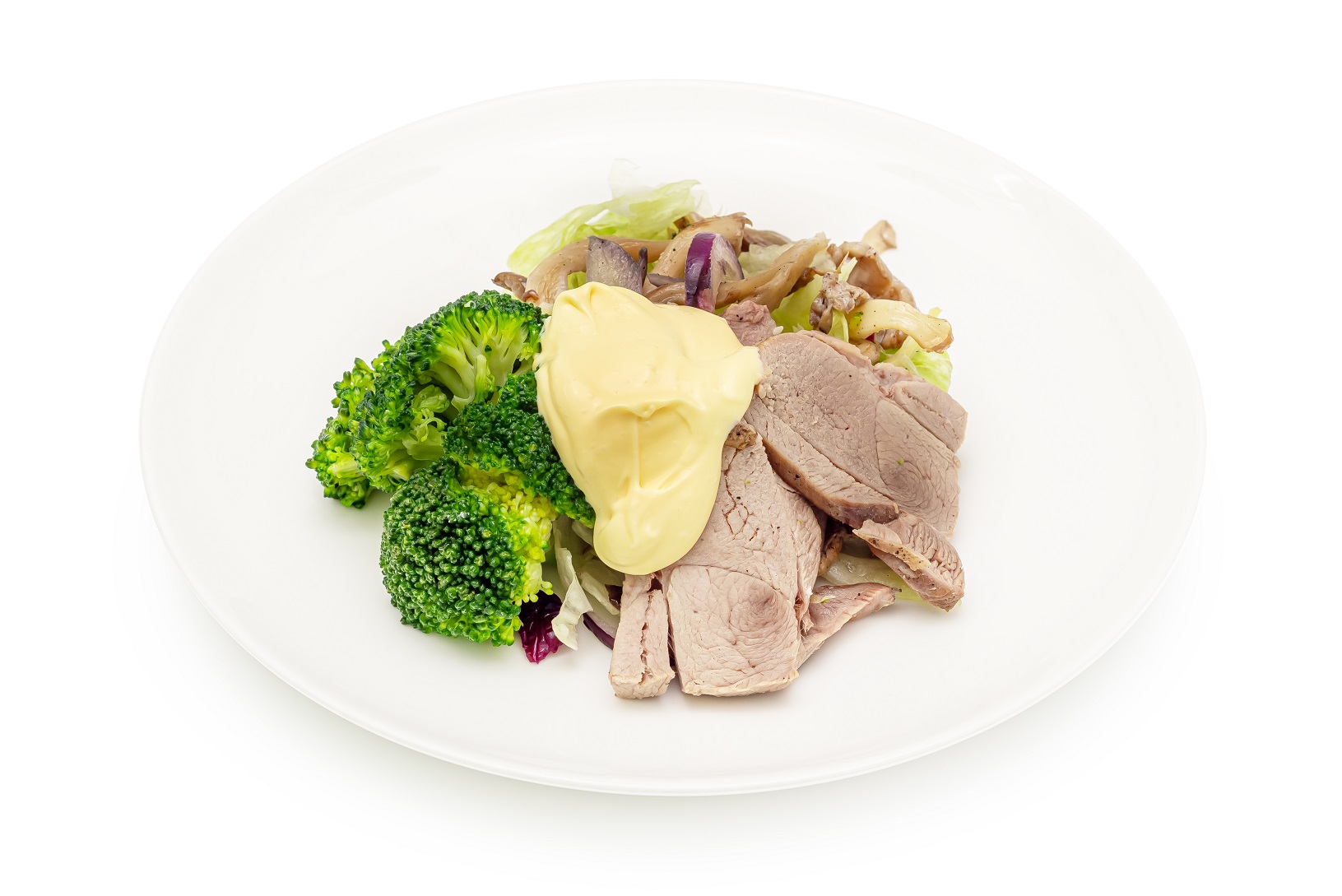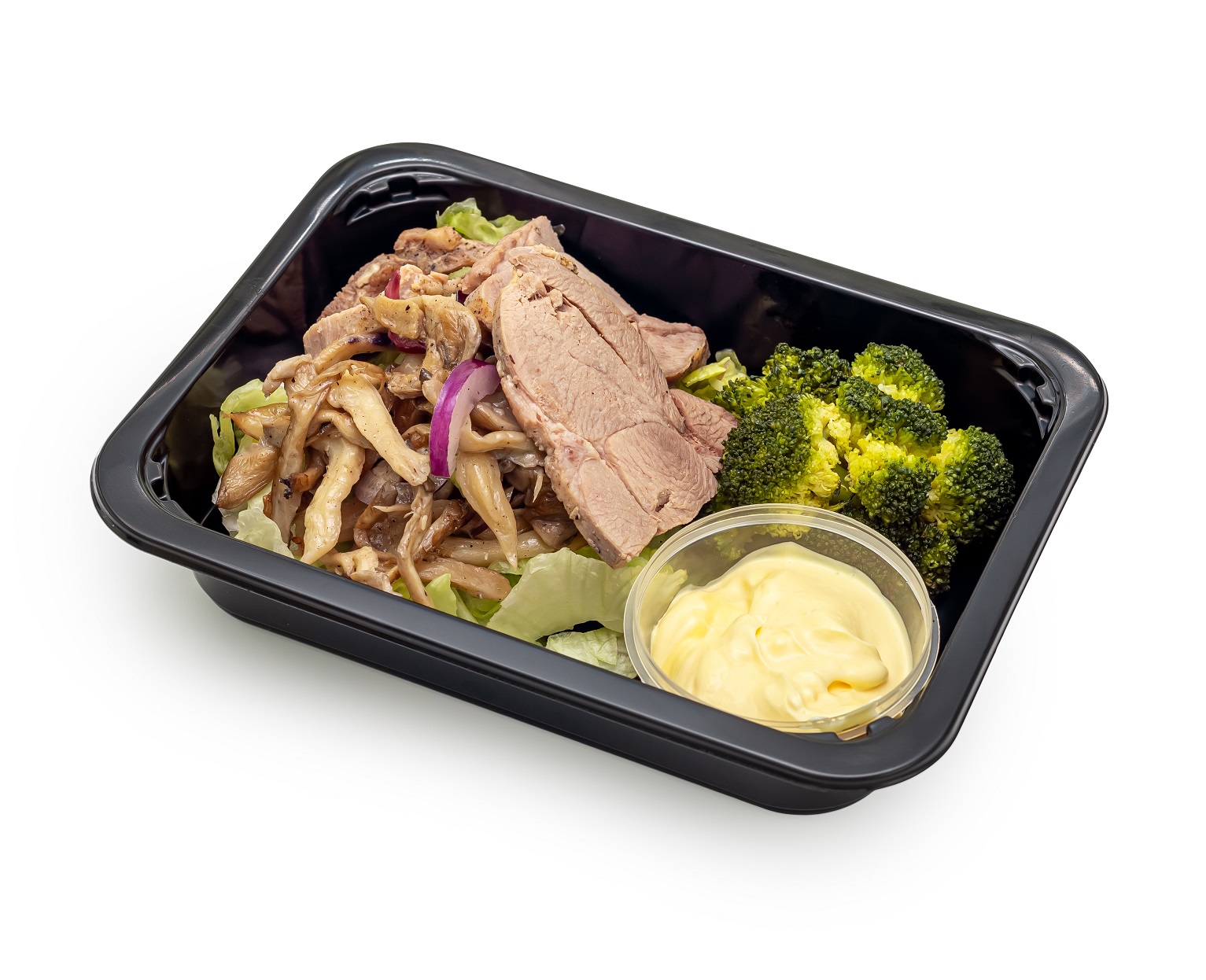 - Салат айсберг, листья свежего шпината, индейка бедро, грибы вешенки, брокколи, лук красный, соус сырный, масло растительное, соль, перец черный молотый.